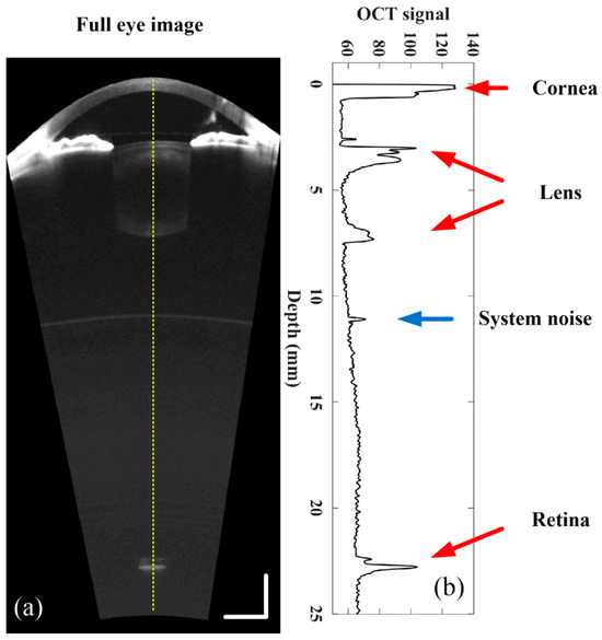 Refraction correction results. (a) Human full-eye image after refraction correction (the yellow dashed line: the visual axis); (b) OCT signal along the yellow dashed line in (a).