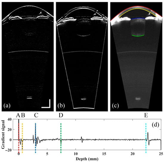 Boundary detection of the image after refraction correction. (a) Ascending gradient template convolution results, highlighting dark to bright borders. (b) The result of descending gradient template convolution, highlighting the border from bright to dark. (c) Boundary extraction results, red, yellow, blue, and green, respectively, represent the anterior and posterior surface of the cornea and the lens. (d) The A-scan gradient signal at the sight axis can clearly show the position of each interface. A–D corresponds to the cornea and lens interface, respectively. A: Anterior corneal surface; B: posterior corneal surface; C: anterior lens surface; D: posterior lens surface; E represents the position of the inner layer of the retina layer.