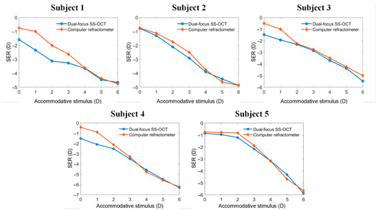 Figure 6 shows the comparison of equivalent spherical refraction obtained from the Dual-focus SS-OCT system and the computer refractometer (Grand Seiko). It was found that the results from Subject 2 and Subject 5 were highly consistent between the two groups. For Subject 1, Subject 3, and Subject 4, there was an approximately 1D difference between the results and the computer refractometer when the accommodative stimulus was small. However, when the accommodative stimulus was larger, the results from both groups tended to converge.