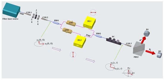 In Equations (5) and (6), u1(z, t) and u2(z, t) are the quartic soliton’s electric field components in orthogonal directions after changing amplitude ratio, time delay, phase difference, propagation distances and fourth-order dispersion. u10 and u20 are constant amplitudes. ∆T is the time delay between the two orthogonal electric fields. z1 and z2 are the propagation distances. ∆φ is the orthogonal phase difference. λ is the central wavelength. The orthogonal electric fields are calculated with the following equation: