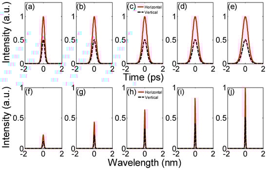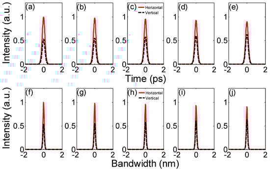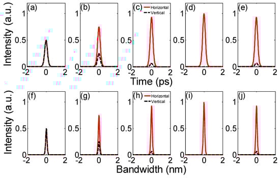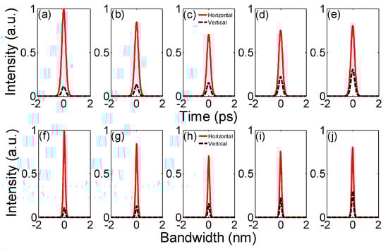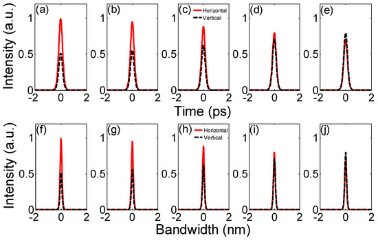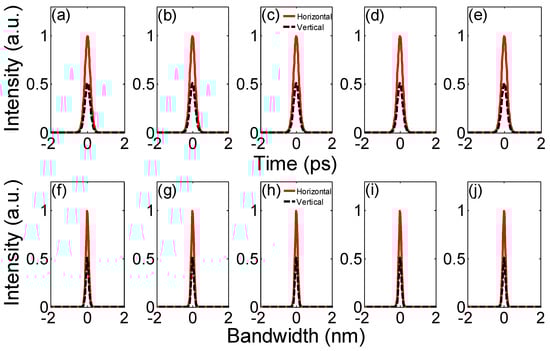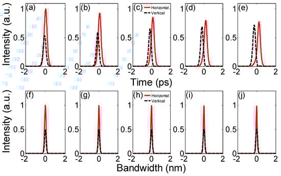 Figure 5 shows the extra-cavity modulation results when ∆φ = π/9, 2π/9, π/3, 4π/9 and 5π/9, u2/u1 = 1/1, θ = 10°, ∆T = 0 ps, z1/LD = z2/LD = 0.1 and β4 = −1 ps4/km. In Figure 5a–e, the peak intensity of the horizontal/vertical pulse decreases/increases with increased ∆φ. It should be noted that the horizontal/vertical pulse’s peak intensity decreases/increases as ∆φ increases from 0 to π, and the orthogonal pulses overlap when ∆φ = π/2. After that, horizontal/vertical pulse peak intensity will increase/decrease when ∆φ increases from π to 2π. Orthogonal pulses will overlap again when ∆φ = 3π/2. And in Figure 5f–j, the optical spectral peak intensities have the same variation trends in orthogonal directions compared with the corresponding pulse shapes’ peak intensities. We can see that the vertical component has higher temporal and optical spectral peak intensities than the horizontal component when ∆φ = 5π/9. Orthogonal pulses and optical spectra are always different when u2/u1 = 1/1, except for some specific ∆φ values.