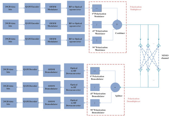 The cross-medium two-hop relay wireless optical communication architecture based on decode-and-forward designed in this paper is shown in Figure 1. For both atmospheric and underwater links, multi-level hybrid multiplexing technology is adopted (Figure 2). In the atmospheric sub-link, 20 Gbps random binary signals in each independent sub-channel first undergo 4-QAM mapping, then are imported into subcarriers of different frequencies through an OFDM modulator and a low-pass filter. Subsequently, a Mach–Zehnder Modulator (MZM) is used to convert these OFDM-modulated signals into optical signals with a wavelength of 1550 nm. The three modulated optical signals (20 Gbps × 3 = 60 Gbps) are converted into polarized light at different angles (0°, 45°, and 90°) through different polarizers, and then these three polarized lights are combined using a polarization combiner before being transmitted into the atmospheric channel via MIMO diversity technology. After atmospheric transmission, the recivers on the water surface relay platform detect multiple optical signals transmitted through the atmospheric channel. The received optical signals are separated into polarized light at different angles (0°, 45°, and 90°), then further converted into electrical signals by PIN photodetectors with a responsivity of 1 A/W. The electrical signals are decoded and de-mapped by an OFDM demodulator, and finally, signal restoration, error detection, and error correction are performed. The restored binary signals serve as the signal source for underwater transmission. Through the decode-and-forward scheme, a transmission scheme nearly identical to that used for atmospheric transmission is adopted (with an optical wavelength of 450 nm) for underwater optical signal transmission.