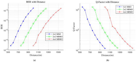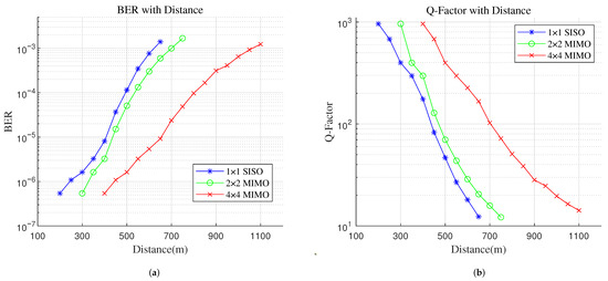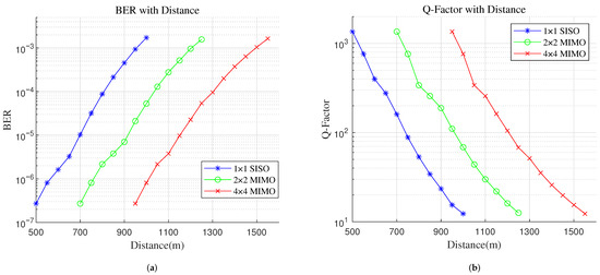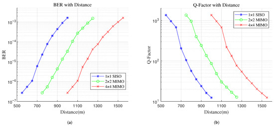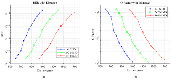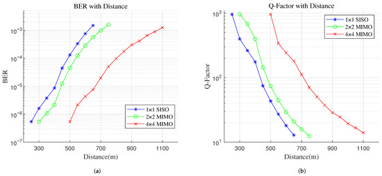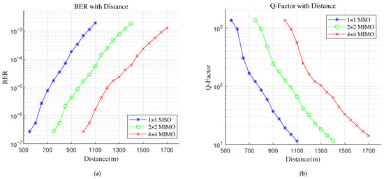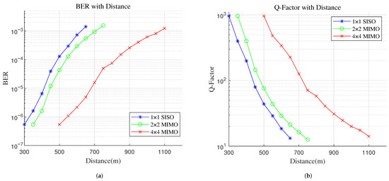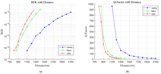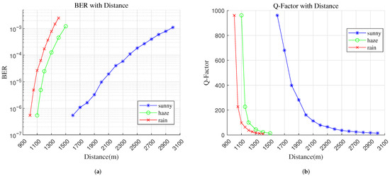 Figure 4. Relationship between the performance of the atmospheric subsystem and transmission distance under Moderate turbulence conditions. (a) BER. (b) Q factor.