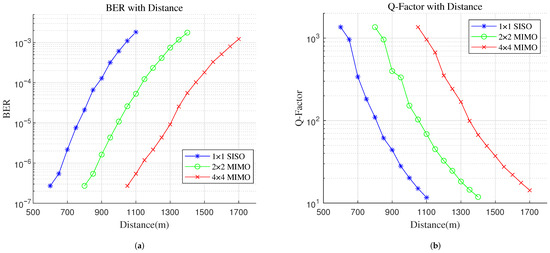 (3) For different hybrid channel environments and system parameter configurations, key performance indicators such as Q factor, bit error rate (BER), and communication distance of the proposed system are simulated and quantitatively evaluated, providing useful references for engineering applications.