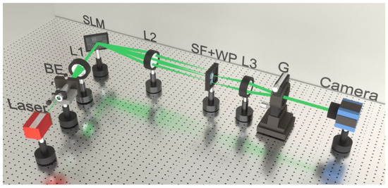 The experimental setup for generating the QGAB is shown in Figure 1, which is a common path interferometric configuration with SLM and 4f system composed of a pair of confocal lenses [25,26,27]. The input linearly polarized light emitted from a laser ( = 532 nm) is expanded by a beam expander (BE). The parallel light formed by the lens L1 is incident on the SLM (Pluto-Vis, Holoeye System Inc., Berlin, Germany). The SLM is located in the input plane of the 4f system which is composed of a pair of lenses L2 and L3. The designed two-dimensional binary blazed holographic grating (spatial frequency: ; phase modulation depth: 0.5) is loaded on the SLM. The st orders (in x- and y-directions) selected by a spatial filter (SF) are converted into a pair of orthogonally polarized base vectors by two wave plates (WPs) located at the Fourier plane of the 4f system. The fast axes of the two wave plates form angles of degrees with the direction of the incident linearly polarized light. The two orders are recombined to form the QGAB by the Ronchi phase grating (G, the period: ; phase modulation depth: 0.5) placed in the output plane of the 4f system. In this way, the QGAB is generated in experiment. To analyze the polarization state, the setup composed of a quarter-wave plate and a polarizer can be used to measure the Stokes parameters of the generated QGAB.