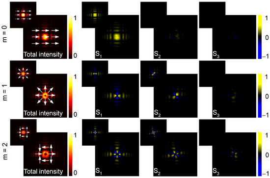 Figure 2 presents the intensity patterns and normalized Stokes parameters of the QGABs when , 1, and 2, respectively. The intensity patterns and polarization states of the QGABs are shown in the first column of Figure 2, and the second to fourth columns display the experimentally measured Stokes parameters , , and . The first row shows the QGAB with x-polarization when . From the total intensity pattern, it can be seen that the main spot is with maximum intensity, and the other secondary spots distribute with fourfold mirror symmetry. The x-polarization of the QGAB can be proved by the Stokes parameters, as the Stokes parameter is positive, while and are almost zero. The second row shows the QGAB when , and the QGAB is with radial polarizations on the wave front. The total intensity pattern is similar with the first row when , and the only difference is that there occurs a central V-point singularity when . As the QGAB is with variant linear polarizations, the Stokes parameter is almost zero, and and are azimuthally variant. When , the QGAB is also with azimuthally variant polarizations, and the linear polarizations rotate with two cycles along the azimuthal direction. The Stokes parameters when are similar to those when , which can prove the azimuthally variant polarization distributions of the QGABs. It is necessary to provide a theoretical analysis of the polarization distribution and the formation mechanism of the V-point singularity based on Equation (2). In Equation (2), is a common expression of the polarization of the cylindrical vector beam [28,29]. is the polarization azimuth, where m dictates the spatial period of the polarization rotation. When , the direction of the linear polarization state rotates through a full cycle along the azimuthal direction, forming a radially distributed polarization state. For , the polarization state rotates through two cycles along the azimuthal direction, leading to the formation of a high-order azimuthal polarization distribution, as depicted in Figure 2. The formation mechanism of the V-point singularity is due to the azimuthally variant polarizations, as it originates from the uncertainty of the orientations of linear polarizations around the singularity. When m increases from 1 to 2, the size of the V-point singularity becomes larger, which is due to the faster variance of the polarizations around the singularity when . The limited resolution of SLM cannot recognize or display the faster variations of polarizations, and the coherent cancellation also occurs between oppositely polarized lights near singularity. Thus, larger m leads to larger size of V-point singularity.