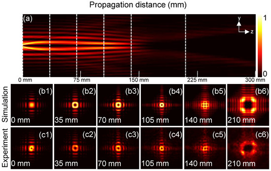 Propagation of the QGAB when . (a) The simulated side view of the QGAB in the y–z plane. (b1–b6) The simulated transverse intensity distributions of the QGAB when mm, 35 mm, 70 mm, 105 mm, 140 mm, and 210 mm, respectively. (c1–c6) The corresponding experimental results. Each transverse intensity pattern has a dimension of .