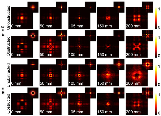 The self-healing property of the QGABs when and 1 at the propagation distances of mm, 50 mm, 105 mm, 150 mm, and 200 mm. The first and third rows show the cases of the unobstructed beams, and the second and fourth rows show the cases of the centrally obstructed beams with square obstruction.