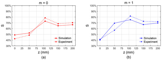 The similarity degree parameter S at different propagation distances when mm, 50 mm, 105 mm, 150 mm, and 200 mm. (a,b) The cases when and 1.