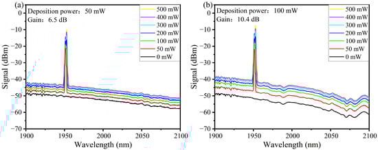 Figure 7 illustrates the output spectra of QD fiber amplifiers fabricated with LD deposition powers of 50–300 mW and amplifier pump powers of 0 to 500 mW. With a gradual rise in deposition power from 50 to 300 mW, there was a corresponding increase in the maximum on-off gain, which had values of 6.5 dB, 10.4 dB, 12.8 dB, 14.6 dB, 15.2 dB, and 15.2 dB at 50 mW, 100 mW, 150 mW, 200 mW, 250 mW, and 300 mW, respectively. For all cases, the deposition time was 10 min. The gain of the PbS QD fiber amplifier did not increase significantly for deposition powers higher than 250 mW because, at higher deposition power, the limited active region of the cone fiber will cause agglomeration of a large number of PbS QDs on the surface of the cone region, which is not conducive to signal light amplification. Note that, owing to the multi-wavelength effect [43] of the 976 nm pump light source, a peak appeared at 1952 nm, which does not affect the gain magnitude and bandwidth achieved and can thus be disregarded.