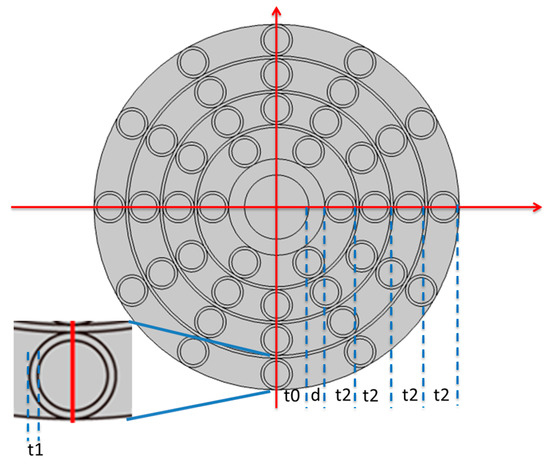 Based on the specific case of an OAM mode in an optical fiber, we conducted an in-depth analysis of the relationship between the structural parameters of the optical fiber and other parameters such as mode purity, mode quantity, and confinement loss. According to the above design criteria, we proposed a new structural design scheme for terahertz photonic crystal orbital angular momentum optical fibers, as shown in Figure 1. We defined the radius of the central air hole as t0, the thickness of the annular core as d, the tube wall thickness as t1, and the thickness of each layer of air holes as t2. As shown in Figure 1, the dimensions of all layers are the same.