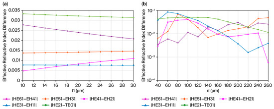 The spin–orbit coupling effect can be effectively reduced by adjusting the thickness of the high-refractive-index ring region, which is key to improving the anti-interference performance of the OAM mode. The average refractive index of the cladding area was calculated by dividing the cladding area into three regions and calculating the weighted average according to the refractive index and the area occupied by each region. Therefore, the average refractive index of the cladding region can be changed by adjusting the thickness of the tube wall in the cladding to obtain the best transmission performance. Figure 2a shows the relationship between the effective refractive index difference and the tube wall thickness. As can be seen from the figure, with a tube wall thickness t1 in the range of 10–30 μm, the effective refractive index difference between the adjacent HE and EH modes in the same OAM mode group is greater than 10−4. Therefore, when the value is 18 μm, the effective refractive index difference between adjacent modes is relatively large. Due to the larger size of terahertz optical fibers compared to traditional optical fibers in the standard wavelength range, changes in the core thickness will cause significant variations in the performance of the optical fibers. In order to obtain the optimal structural parameters, it is necessary to conduct large-scale simulations while varying the parameters. Within certain small frequency ranges, there may be excessive mode loss. The optimal parameters were found by searching within the intervals where the effective refractive index difference trend was shown to be stable between different modes in the same group.