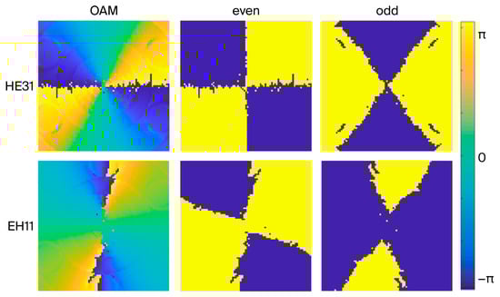 In optical fibers, OAM modes are formed through the linear combination of the odd and even modes of the vector eigenmodes HE or EH with a phase difference of π/2. This endows OAM modes with unique properties, enabling them to stably transmit in optical fibers and carry orbital angular momentum information [4,5,6]. When the topological charge is greater than 1, a mode group consists of four OAM modes. These modes show different polarization and phase characteristics in optical fibers but are all combined based on the same topological charge. They can coexist and independently transmit information, providing more options for optical fiber communication. When the topological charge is equal to 1, a mode group only consists of two OAM modes. This is because in the special case of 1, the method of combining vector eigenmodes is relatively simple, resulting in a reduction in the number of OAM modes generated.