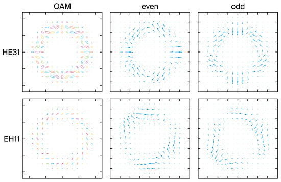 Polarization describes changes in the direction and magnitude of a beam’s electric field vector with time. In an OAM mode, the polarization distribution shows complex and diverse forms which are closely related to its phase structure, quantum number, and production mode. Figure 5 shows the polarization distribution of the eigenmodes when the topological charge is 2. In the figure, small colored ellipses are used to represent the polarization states of the electric field vector, where the direction and magnitude of each ellipse reflect the direction and magnitude of the electric field vector, respectively. Due to the complexity of OAM modes, the distribution of these ovals across cross-sections is often uneven, resulting in unique polarization patterns. In the figure, the ellipticity of each small colored ellipse is used to represent spin–orbit coupling strength. Spin–orbit coupling is a physical phenomenon that describes the interaction between spin angular momentum (SAM) and OAM in a light beam. The larger the ellipticity, the more complex the direction and size distribution of the electric field vector in the cross-section, and the greater the spin–orbit coupling strength.
