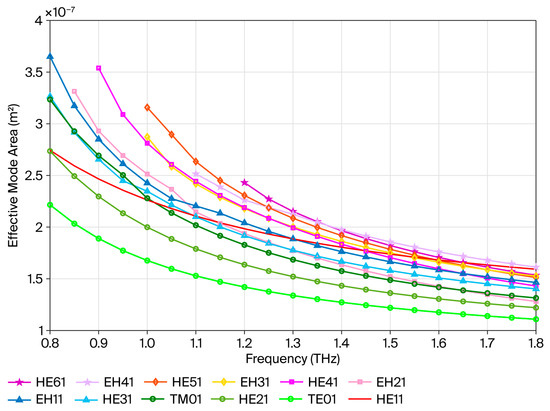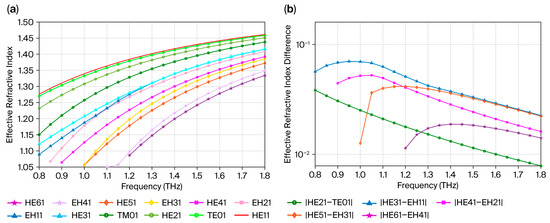 Figure 6a shows that the effective refractive index of different vector modes increases with an increase in frequency. This is an important parameter used to describe the mode propagation in an optical fiber, which reflects the phase velocity of the light wave propagating in the waveguide. In Figure 6, the value of the effective refractive index varies between 1.05 and 1.48, indicating that the propagation of light waves through the waveguide slows down and the phase delay increases as the frequency increases. The figure also shows that the effective refractive indices of the four modes in the same module group are relatively close. This means that the propagation properties of these modes in waveguides are similar, and the interaction between them may be weaker, helping to maintain signal stability and clarity in optical communications and other applications. Figure 6b shows the difference in effective refractive index between the EH and HE modes with frequency. This is an important factor for measuring differences in propagation speed between different modes. For higher-order modes, Figure 6b shows that the effective refractive index difference in adjacent modes first increases and then decreases as frequency increases. This means that in the high-frequency range, the difference in propagation speed between high-order modes may first increase and then decrease, which may be related to the dispersion effect in the waveguide. Unlike the high-order mode, the effective refractive index difference in the low-order mode decreases as frequency increases. This shows that in the low-frequency range, the difference in propagation speed between low-order modes gradually decreases, which helps to maintain signal stability and consistency in optical communication.