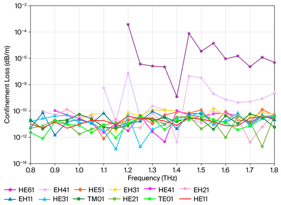 In PCFs, due to the limitations of lateral distribution, confinement loss occurs, which is mainly determined by the imaginary part of the effective refractive index. Figure 7 presents the maximum confinement loss in various terahertz OAM PCF modes in the frequency range of 0.8 THz to 1.8 THz. Except for the EH41 and HE61 modes, the maximum constraint loss is approximately 10−10 dB/m. The mode field distribution of high-order modes is more complex and easily coupled with the periodic structure in the PCF cladding, resulting in energy leaking into the radiation mode. The low confinement loss indicates that the designed PCF structure is effective at constraining OAM modes, which can effectively suppress mode field diffusion and avoid phase distortion.