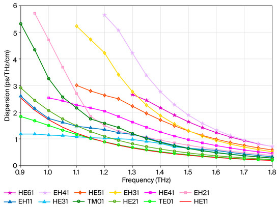 Dispersion is a separation phenomenon caused by different frequencies of light traveling at different speeds in the medium. As shown in Figure 8, the mode dispersion gradually decreases as the frequency increases. This means that at higher frequencies, the difference in the propagation speed of different light wavelengths is reduced in the medium, so the dispersion phenomenon is weakened. The figure also shows the dispersion difference between the higher-order and lower-order modes. The dispersion of the higher-order modes changes more significantly than that of the lower-order modes. This is because higher-order modes have more complex propagation paths through the medium, or they are more sensitive to changes in its properties. As a result, the dispersion of higher-order modes exhibits greater fluctuations as the frequency changes.