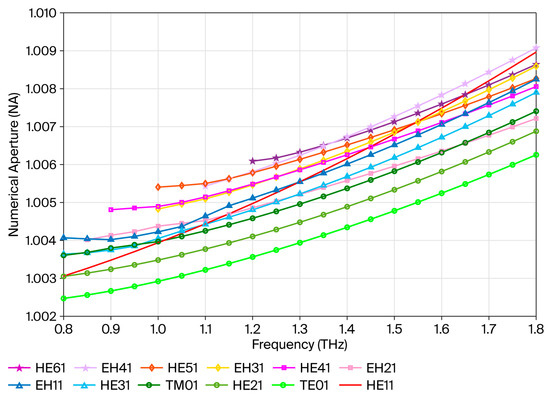 Figure 10 shows that the numerical aperture curves of various OAM modes are very close, in the frequency range of 0.8 THz to 1.8 THz. This indicates that at the aforementioned frequency conditions, the ability of the fiber to bind to different OAM modes is similar, or that the propagation characteristics of these modes in the fiber are relatively stable. Although the curves of each mode are close, the numerical aperture increases with frequency. This is because the high-frequency light alters the effective refractive index difference between the core and the cladding of the optical fiber, or the propagation mode characteristics of the light, thereby counteracting the originally weakened binding effect of short-wavelength light, and ultimately increasing the numerical aperture. This means that at higher frequency, the optical fiber may receive a smaller range of light angles, affecting its coupling efficiency and transmission performance.