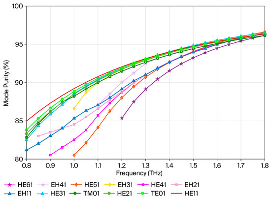 Figure 11 shows that in the frequency range of 0.8 to 1.8 THz, the purity of all vector modes in the terahertz OAM PCF increases with the transmission frequency, ranging from 80% to 96%. This shows that as the frequency increases, the vector mode in the fiber becomes more stable, with less coupling or interference with other modes, thus maintaining a high mode purity.