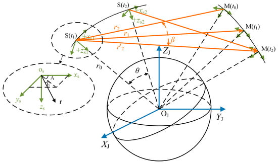 In Figure 1, the position of satellite S in the J2000 coordinate system is denoted as p(xJ, yJ, zJ), and the velocity is denoted as v(vJx, vJy, vJz). For a three-axis stabilized satellite S, the origin of its body coordinate system is taken from the center of mass of the satellite, where Xs is the rolling axis, Ys is the elevation axis, and Zs is the yawing axis. When the flight attitude angle of the satellite is 0, the body coordinate system of the satellite coincides with the centroid orbit coordinate system. In this case, the coordinates δrJ(xJ, yJ, zJ) under the inertial ordinate system can be converted to the coordinates δrs(xs, ys, zs) under the centroid orbit coordinate system, and the conversion relationship can be expressed as: