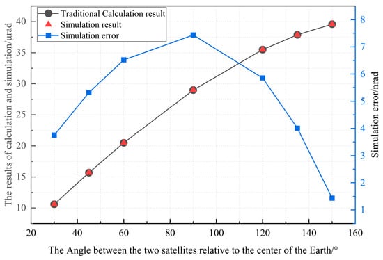 Figure 2 shows the simulated point-ahead angle results and the corresponding errors when the geocentric angle α is set to be 30°, 45°, 60°, 90°, 120°, 135°, and 150°, respectively. As shown in Figure 2, with the increase in α, the point-ahead angle of the GEO-GEO ISLL increases. Specifically, when the geocentric angle α is 30°, the simulated point-ahead angle β is 10.610 μrad, and when the geocentric angle α is 120°, the simulated point-ahead angle β is 35.502 μrad. For better comparison, the calculated curve of the relation between the point-ahead angle β and the geocentric angle α obtained from traditional Equation (14) is also given in Figure 2. Therefore, by comparing and analyzing the results obtained by Equation (14) and the algorithm proposed in this paper, the estimation error of the proposed algorithm is less than 7.5 nrad.
