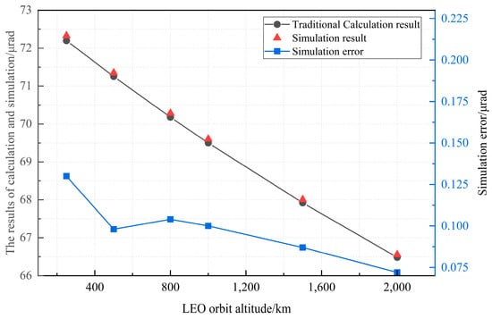 Figure 3 shows the simulated point-ahead angle results and the corresponding errors when the orbital inclination i is fixed at 0° and the orbital altitude h is set to be 250 km, 500 km, 800 km, 1000 km, 1500 km, and 2000 km. As shown in Figure 3, with the increase in h, the point-ahead angle of the LEO-GEO ISLL decreases. When the orbital altitude h is 250 km, the calculated maximum point-ahead angle β is 72.329 μrad, and when the orbital altitude h is 2000 km, the simulated maximum point-ahead angle β is 66.556 μrad. By comparing and analyzing the results obtained by traditional Equation (15) and the algorithm proposed in this paper, the estimation error of the proposed algorithm is less than 0.15 nrad.