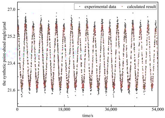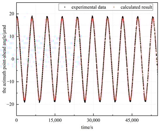 Figure 4 shows the calculated results and experimental data of the azimuth point-ahead angle. It can be seen from Figure 4 that the azimuth point-ahead angle of the ISLL varies in period for the time, and the corresponding calculation error varies from −19.1431 μrad to +19.0736 μrad. The Pearson correlation between the calculated results and the experimental data is 99.91%.