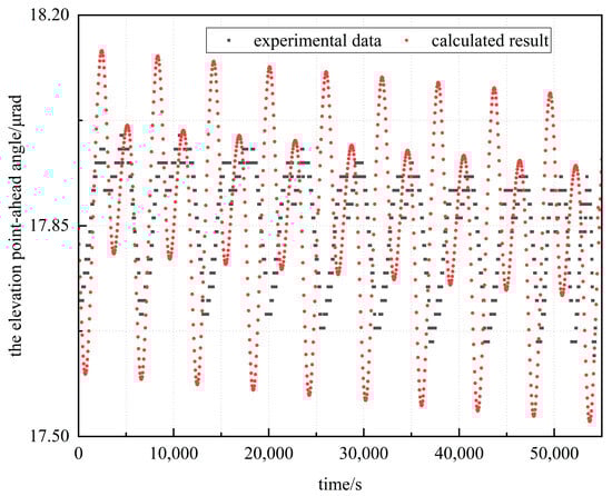 Figure 5 presents the calculated elevation point-ahead angle results of the ISLL and the on-orbit experimental data. As can be seen from Figure 5, the elevation point-ahead angle of the ISLL changes periodically along with the orbital motion, and the corresponding elevation point-ahead angle changes from 16.8625 μrad to 18.7351 μrad. The Pearson correlation coefficient between the calculated results and the actual experimental data of the ISLL is 52.3167%, which is mainly caused by the actual driving error of the fast-steering mirror used in the laser terminal.