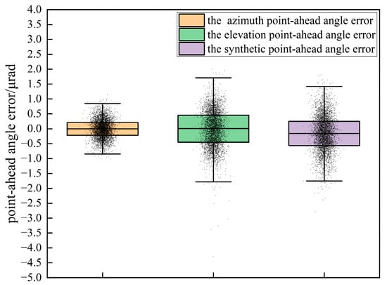 According to the above analysis and discussion results, the error distribution of the calculated point-ahead angle based on the proposed algorithm is shown in Figure 7. As can be seen from Figure 7, the mean calculation errors of the elevation, azimuth, and combined point-ahead angle are −5.8510 nrad, −1.0945 nrad, and −79.5403 nrad, respectively, and the square deviations are 0.6048, 0.3151, and 0.3005, respectively. The maximum calculation error of the proposed algorithm is 5.2103%, indicating that the calculation accuracy is better than 94%.