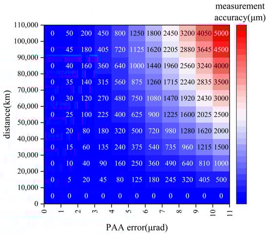 Based on this relationship, the precision of laser ranging was calculated under different conditions as follows, as shown in Figure 8. We can observe that the measurement error of laser ranging decreases as the PAA error decreases. Based on the PAA prediction algorithm proposed, the PAA error is bellow 1 μrad. Therefore, the measurement error of laser ranging is less than 50 μm.