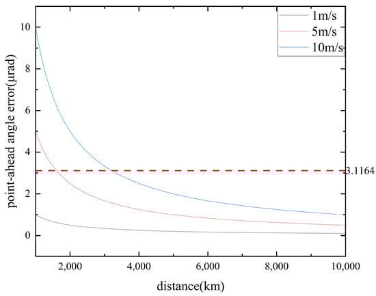 To maintain the stability of the ISLL, the PAA calculation error needs to be eliminated. Compared with other traditional calculation method (μrad and sub-μrad accuracy), our method shows higher performance (nrad accuracy) in precision and is more suitable for multiple scenarios such as GEO-GEO, GEO-LEO, and LEO-LEO [,]. Apart from the calculation error, the PAA error is also affected by the orbital recurrence accuracy. When the inter satellite distance is 10,000 km, a 1 m/s orbital recurrence accuracy will result in a pointing error of 100 nrad, as shown in Figure 9. When the distance becomes larger, the calculation accuracy of PAA has a greater impact on the PAA error. Therefore, improving the accuracy of the PAA is of great significance for the establishment and stability of the ISLL. In addition, for engineering applications, the higher the link stability, the higher the requirement for the PAA accuracy. Therefore, high PAA accuracy can provide engineering reserves for the long-term application of the ISLL. Meanwhile, the accuracy of the PAA is a crucial parameter used to characterize the ranging accuracy, in which improving the accuracy of PAA is also important for enhancing the measurement accuracy.