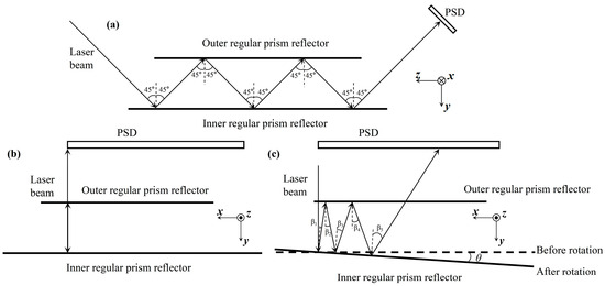 First, using the yz-plane as the principal section, when the incidence angle is fixed at 45° and the inner and outer reflectors are parallel, the length of the reflector surfaces can be designed to ensure that the measurement laser beam undergoes exactly five reflections before accurately reaching the photosensitive plane of the PSD, as shown in Figure 1a.