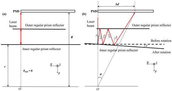 Schematic diagram of the angle measurement principle, with the red arrow indicating the trajectory of the measurement Laser, (a) when the inner and outer reflectors are parallel; (b) when the inner reflector is rotated by a small angle θ.