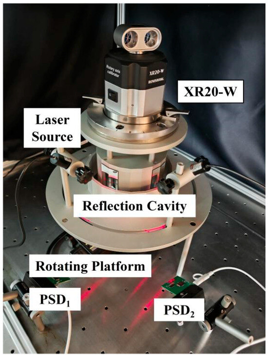 The physical prototype of the complete sensor system is presented in Figure 4. The system primarily adopts the dual-reflector structure detailed in the Section 2, amplifying the target angle through multiple reflections. The laser (model FU655AD5-GD1670, produced by Dongguan Yiquan Electronic Technology Co., Ltd., Dongguan, China.), with a wavelength of 650 nm, a spot size of ~2 mm, and a rated power of 5 mW) is rigidly coupled to the stationary housing; meanwhile, the inner prism is affixed to the rotational platform. The PSD is externally mounted to the sensor assembly. Its photosensitive surface measures 0.1 × 1.2 cm2, but only an area of approximately 0.1 × 0.3 cm2 is utilized due to significant measurement inaccuracies observed near both edges. After undergoing five reflections within the optical path, the measurement laser beam impinges on the effective photosensitive area of the PSD. Positional data is subsequently acquired and converted to determine the target angle.