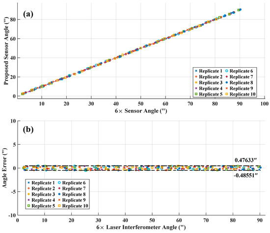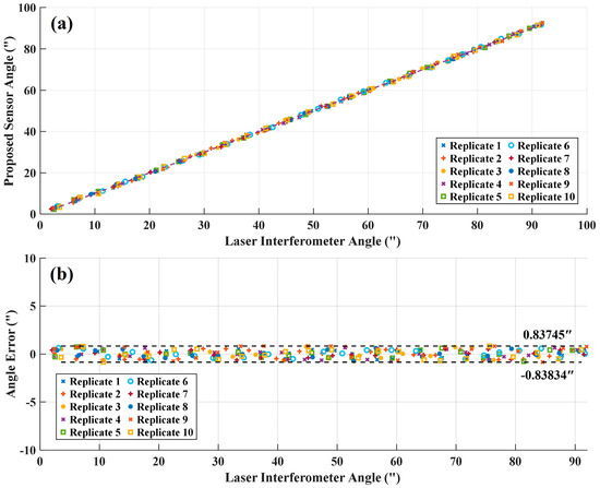 To validate the measurement principle and accuracy of the sensor prototype, comparative experiments were conducted against the Renishaw XR20-W angular measurement module (±1″ accuracy). Experimental datasets from multiple trials were processed to quantify measurement deviations. Ten experimental replicates were performed, with measured angles and corresponding errors depicted in Figure 5a and Figure 5b, respectively. Comparative analysis demonstrates close agreement between the developed sensor and XR20-W (Renishaw plc, London, UK) laser interferometer measurements, exhibiting mutual discrepancies within ±0.85″. Considering the intrinsic ±1″ uncertainty of the XR20-W reference system, both instruments demonstrate comparable measurement precision.