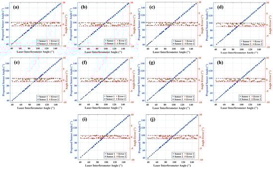To extend the sensor’s measurement range, a multi-units alternating measurement strategy was implemented for continuous angular monitoring. This approach achieves uninterrupted measurement through coordinated spatial distribution of discrete sensing units. When one unit approaches its blind zone, adjacent units enter effective measurement ranges, ensuring ≥2 units remain operational at transition boundaries to enable seamless probe alternation. With the laser interferometer as the calibration reference, the measurement data and corresponding error distributions are shown in Figure 7, denoted by blue and red scatter points, respectively.