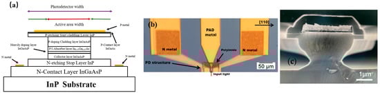 - Kato, K.; Hata, S.; Kozen, A.; Oku, S.; Matsumoto, S.; Yoshida, J. 22 Ghz Photodiode Monolithically Integrated with Optical Wave-Guide on Semiinsulating Inp Using Novel Butt-Joint Structure. Electron. Lett. 1992, 28, 1140–1142. [Google Scholar] [CrossRef]