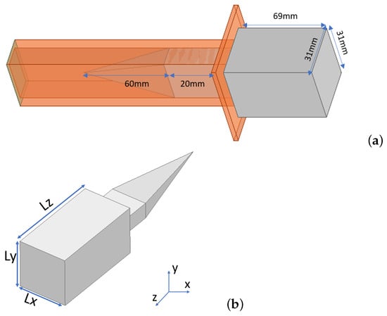 The lens (Figure 1b) includes a pyramidal transition section partially inserted into the waveguide. This transition is composed of a PTFE pyramid with a height of 60 mm and a rectangular base of 22.86 mm × 10.16 mm, corresponding to the inner cross-section of the WR90 waveguide. Its purpose is to reduce insertion losses by mitigating impedance mismatch at the dielectric–metal interface. This section is followed by a uniform dielectric region that fully occupies the waveguide interior over a length of 200 mm. The lens then extends into free space beyond the waveguide, forming the electromagnetic jet-generating region. Following a comprehensive parametric study, the external lens geometry was optimized to maximize the field concentration and control the jet characteristics. The final dimensions of the lens are 69 mm × 31 mm × 31 mm (length × width × height).