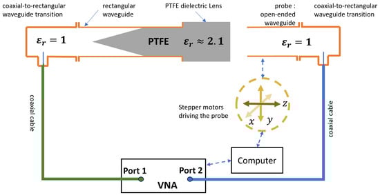 To obtain the spatial distribution of the electromagnetic field, the probe waveguide is driven by stepper motors, allowing scanning along the x, y, or z axes as required (Figure 2).