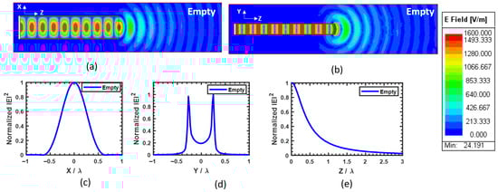 Analysis of Figure 3a,b reveals that the electric field is primarily confined within the waveguide. The portion of the field radiated into free space in the near-field region adopts a spherical shape immediately after exiting the waveguide. Figure 3c,d show the intensity profile extracted in air at the waveguide aperture (). A half-power beamwidth of is observed along the x-axis, while the electric field is mainly concentrated along the metallic surface of the waveguide in the y-direction. To assess the beam length, a longitudinal section starting from the aperture—shown in Figure 3e—demonstrates exponential decay of the electromagnetic field intensity. These observations are consistent with previously reported results in the literature [19,20].