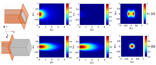 Modeling of electric field intensity at 12 GHz for an open waveguide (a) with impedance matching (part 1) and (b) with the addition of the electromagnetic jet lens. The field mappings in the right-hand column are presented at the z-plane corresponding to the maximum field intensity.