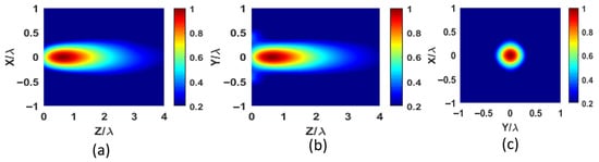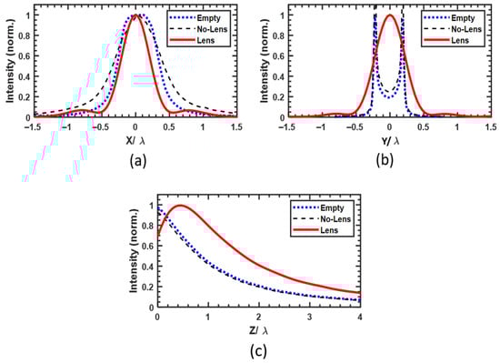 In addition to displacing the focal point outside the waveguide structure and enhancing the spatial confinement of the focused field, the lens also contributes to a reduction in the beam’s full width at half maximum (FWHM). Specifically, the FWHM decreases from 0.82λ to 0.59λ along the x-axis (Figure 5a), and it drops below the diffraction limit, reaching 0.41λ, along the y-axis (Figure 5b). Furthermore, along the z-axis, the lens significantly extends the longitudinal extent of the high-intensity region in the propagation direction, as shown in Figure 5c. This extended focal region is particularly advantageous for enabling subsequent contactless characterization or interaction with external samples positioned beyond the waveguide aperture.