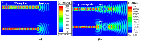 Figure 4a presents the electromagnetic field intensity concentration at the output of the waveguide equipped solely with the impedance-matching section, excluding the lens. The impedance matching and the dielectric loading do not induce any significant alteration in the field concentration at the aperture. As previously observed in Figure 3, the field concentration remains comparable to that of the unloaded waveguide.
