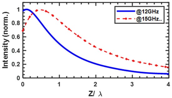 Moreover, although the phenomenon is observed at a different frequency, it exhibits similar characteristics to those observed at 12 GHz. The frequency increase slightly extends the beam length and shifts the location of the peak electric field intensity further from the lens output, as shown in Figure 8, while the beam width remains essentially unchanged.