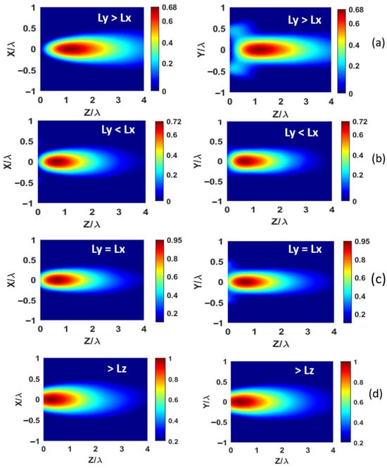In Figure 9c, the transverse dimensions are set to equal values (). Although the transverse dimensions are equal, the resulting field concentration remains non-symmetric, indicating that geometric symmetry does not guarantee a symmetric electromagnetic beam. Nevertheless, this non-symmetry leads to a beam length in the y-direction under the diffraction limit () accompanied by an increase in the maximum field intensity.