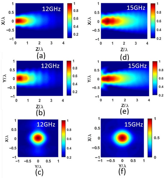 Experimental measurement of normalized intensity at the output of the PTFE lens: (a) plane, (b) plane, and (c) plane at 12 GHz; (d) plane, (e) plane, and (f) plane at 15 GHz.