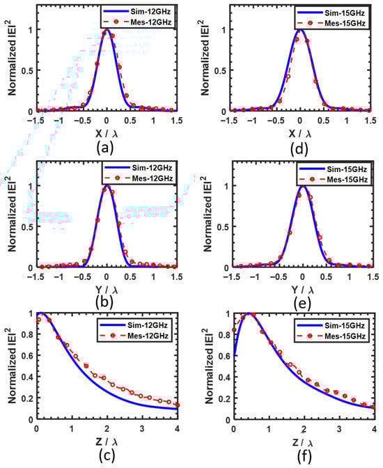 Normalized intensity profiles () along a line passing through the focal point. Profiles at 12 GHz are shown in (a) along the x-axis, (b) along the y-axis, and (c) along the z-axis; profiles at 15 GHz are shown in (d) along the x-axis, (e) along the y-axis, and (f) along the z-axis. The experimental measurements (markers) are compared with the numerical simulations (solid lines), showing very good agreement.