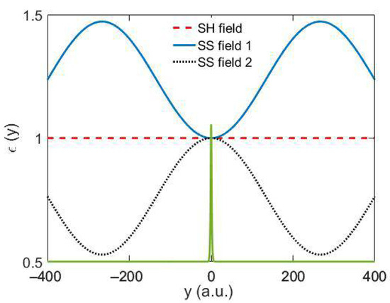 In Equation (7), indicates the space dependence of the laser field. The development of high-quality metasurface nanostructures offers an approach to generate a SS field [22,23,24,25,26]. The spatial distribution of the field amplitude can be modulated by designing the structure of the metasurface. Here, two kinds of spatial structure are considered and are shown in Figure 1 by the blue and the dotted black curves, respectively. For comparison, the transverse structure of the SH field with = 1 is demonstrated in Figure 1 by the dashed red curve. From Figure 1, one can see that there is a valley around the core for the SS field 1 and a peak for the SS field 2. The amplitude of the SS fields and the SH field have nearly the same value around the core from −20 a.u. to 20 a.u. The transverse distribution of the ground state wavefunction is also depicted in Figure 1 by the green curve. One can see that the distribution of electron wavefunction is in the range of −20 a.u. to 20 a.u. This indicates that the main part of the electron wavepacket experiences the same laser field in the three cases of the SS fields and the SH field, except for the part that spreads out due to the quantum diffusion effect. Hence, the electron dynamics process (i.e., ionization, acceleration, and recombination) of HHG is identical for the three lasers. By comparison with the case of the SH field, we can investigate the influence of the SS fields on the diffusion part of the electron wavepacket and finally on the harmonic spectrum.
