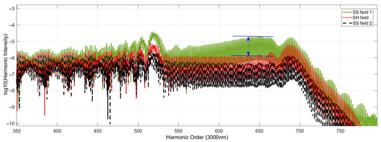 We take the argon atom as an example and the soft-core parameter takes the value of 0.63 to simulate the ionization potential of the argon atom (15.76 eV). In Figure 2, the harmonic spectra driven by the SS fields and the SH field are presented. From Figure 2, two obvious characteristics are observed. Firstly, the harmonic spectra have a very broadband plateau, and the cutoffs of all the three spectra are located at the 681st harmonics (corresponding photon energy is about 281 eV). The same cutoffs of the three harmonic spectra indicate an identical electron dynamics process of HHG, which is consistent with the discussion of Figure 1. The second characteristic shown in Figure 2 is an obvious enhancement of the harmonics driven by the SS field 1 throughout the spectrum, compared with the harmonic spectrum driven by the SH field. From 600th order to 670th order, the harmonic intensities are enhanced by an order of magnitude, as shown by the blue double arrow. In the case of the SS field 2 shown by the dashed black curve, a suppression of the harmonic intensity is observed throughout the spectrum.