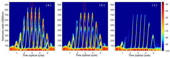 The time-frequency analysis of the harmonic spectra driven by the SS field 1 (a), the SH field (b), and the SS field 2 (c). The corresponding spectra are presented in Figure 2. The second dominating emission peak from to is indicated by the dashed red lines in panel (a) and panel (b).